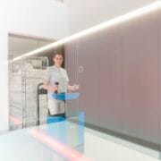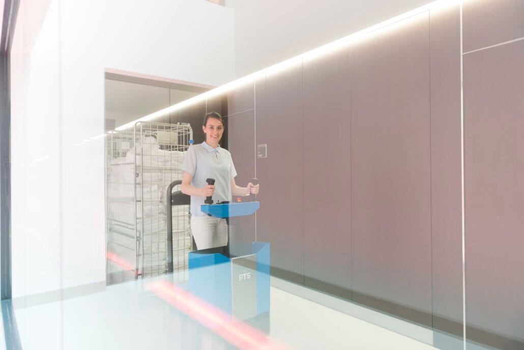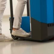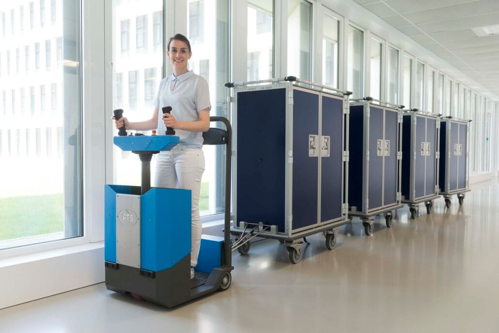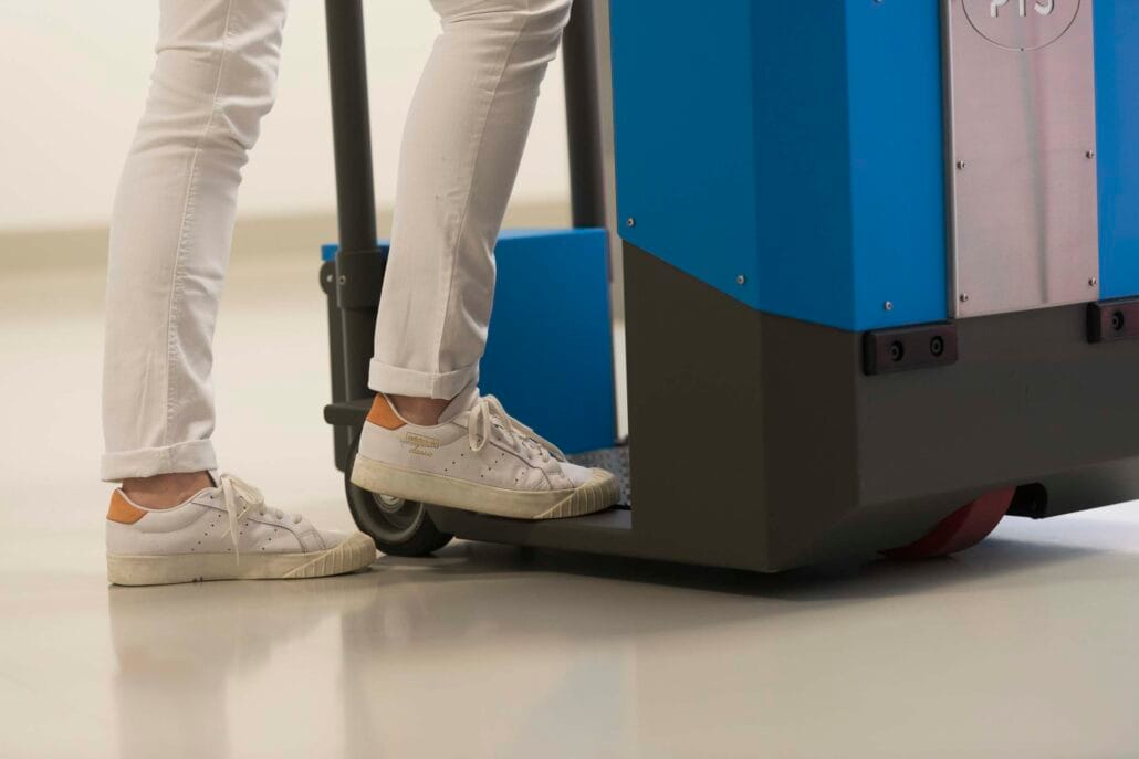 With its compact dimensions of 850 x 600 mm, the “Bull” Step Drive transporter doesn’t take up much space. This makes it easy to drive in confined spaces and, thanks to its short turning radius (360°), you can also easily turn around in confined spaces or corridors.
